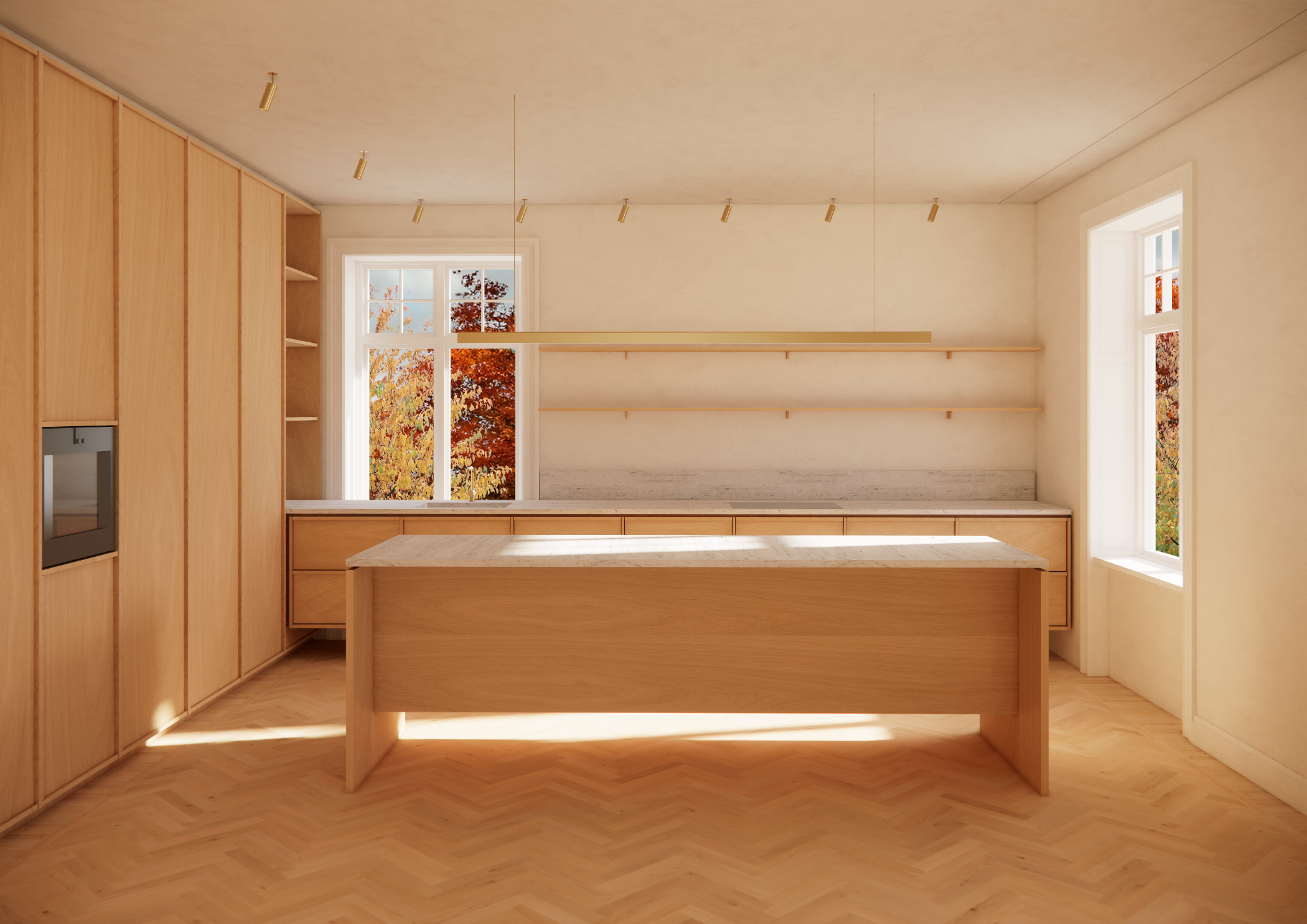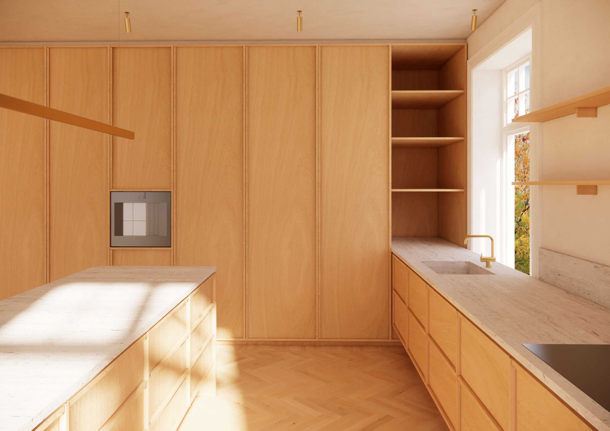 A minimalistic, modern kitchen with natural wood cabinets, a built-in seating area by a skylight window, and a large glass door leading to a balcony, letting in natural light.