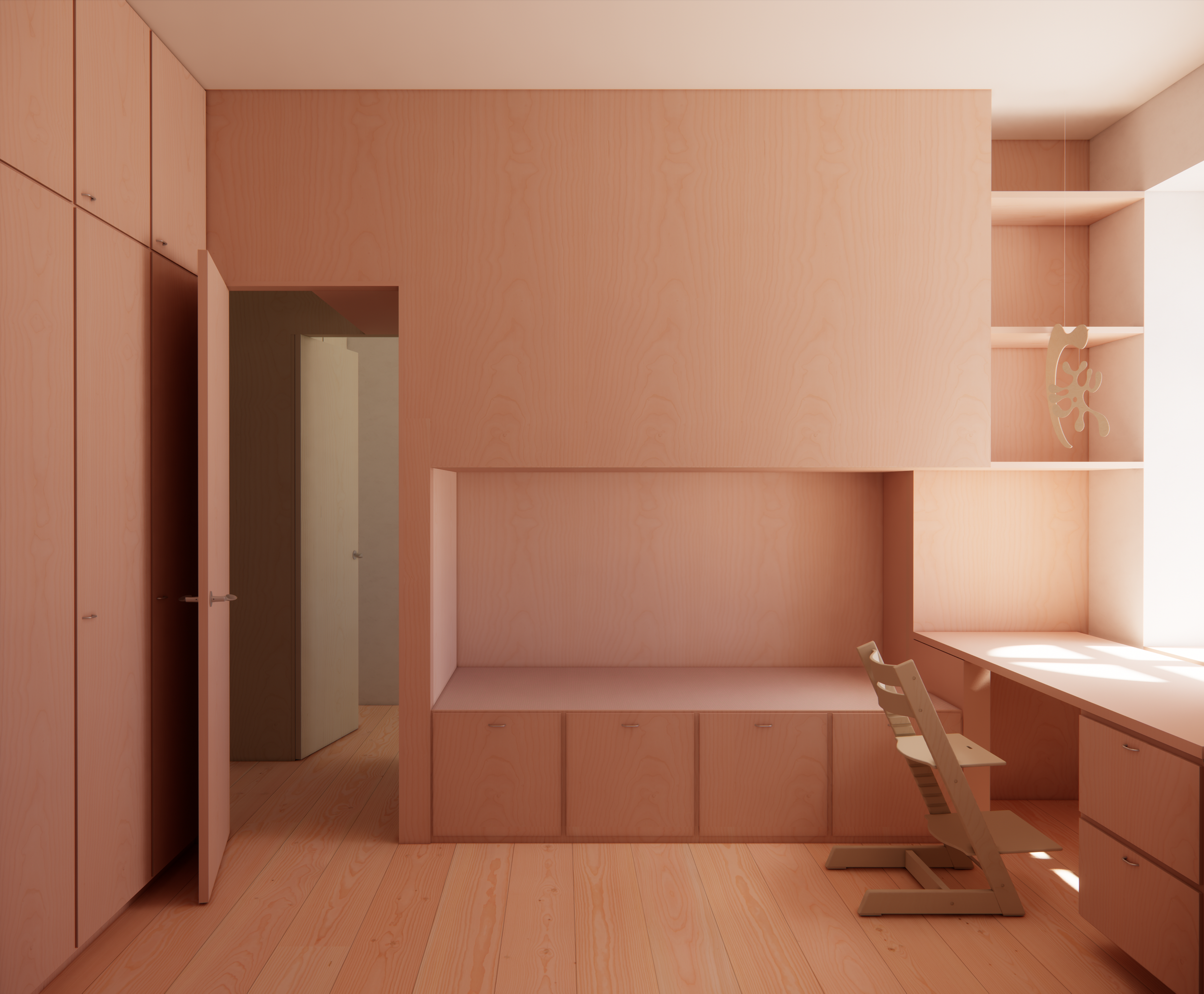 The former large room is divided into two children’s rooms, structured around a custom-designed furniture unit incorporating beds, storage, desks, and shelving. The solution maximizes functionality while giving each room a distinct identity.