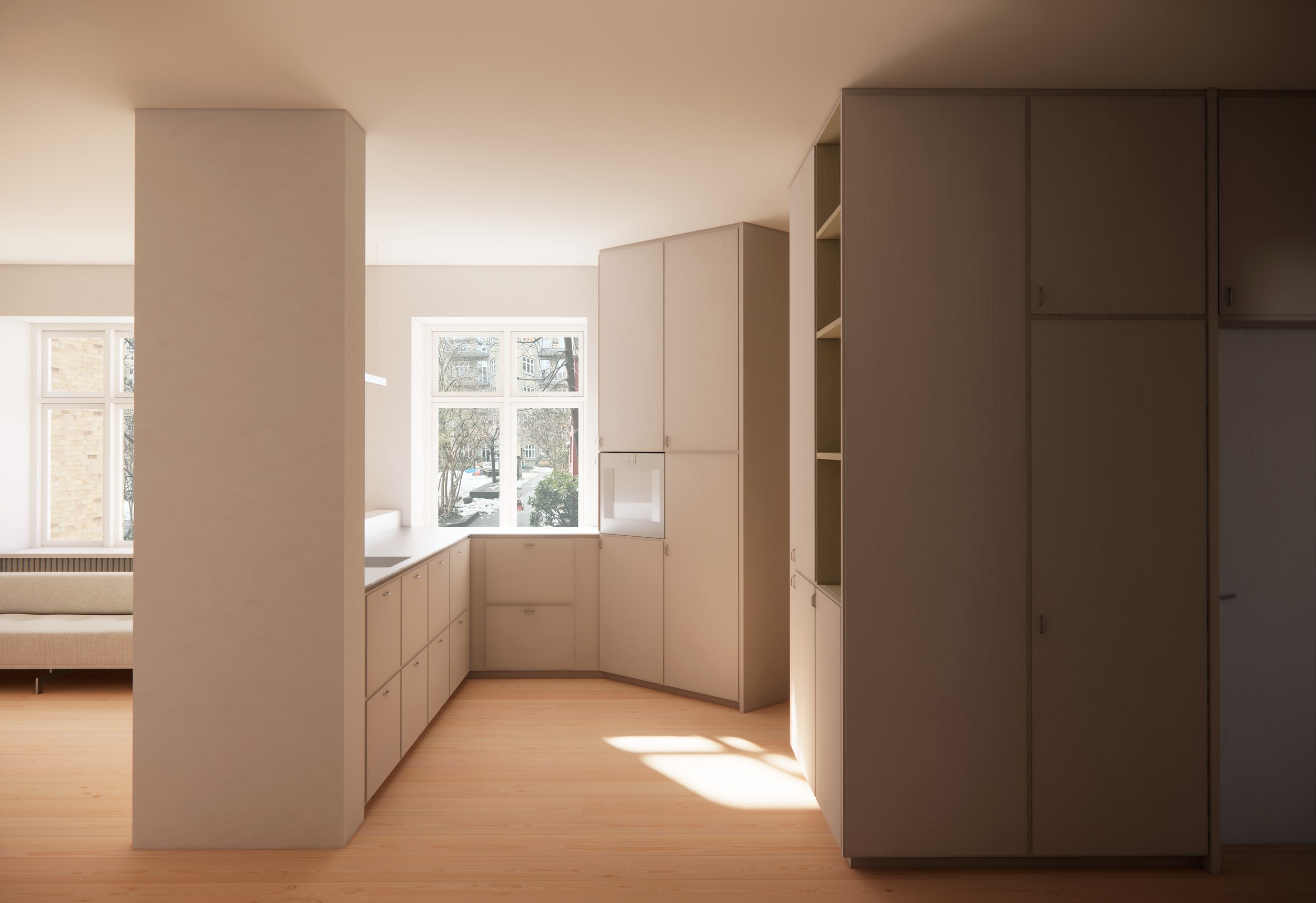 The intervention is primarily realized through integrated, durable furniture elements inserted within the existing framework. These provide functional, long-lasting solutions while establishing a calm and timeless architectural expression.